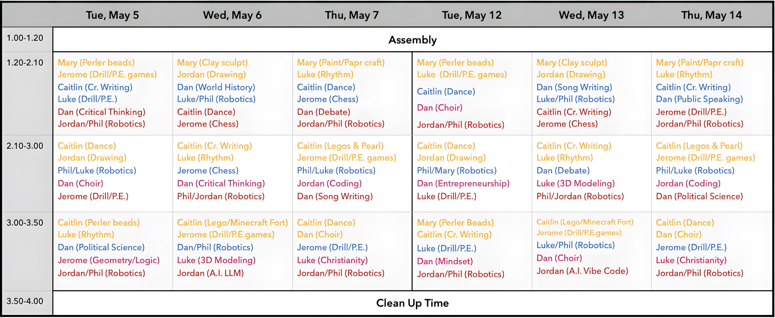 Each afternoon runs from 1:00 to 4:00 PM. Every slot offers multiple classes in parallel — your child picks what interests them.